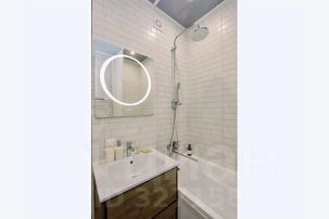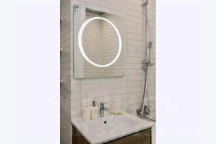 Санузел: ванна, современная отделка, зеркало с подсветкой, свежие полотенца.