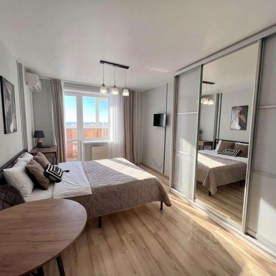 Зоны и оснащение:• Кухнягостиная: техника, посуда, обеденный стол, диван, ТВ• Спальня: удобная кровать, система хранения• Санузел: ванна, зеркало, свежие полотенца• Балкон: открытое пространство с видом во двор