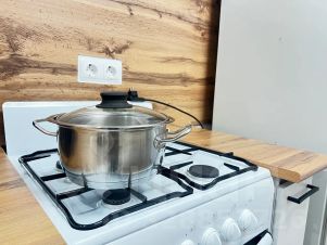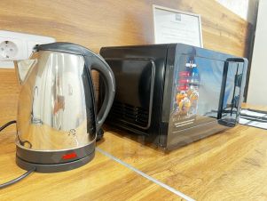 Кухня: холодильник, плита, чайник, микроволновая печь.