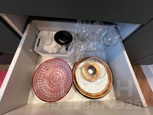 Кухня: холодильник, чайник, микроволновая печь, необходимая посуда, приборы и бокалы.