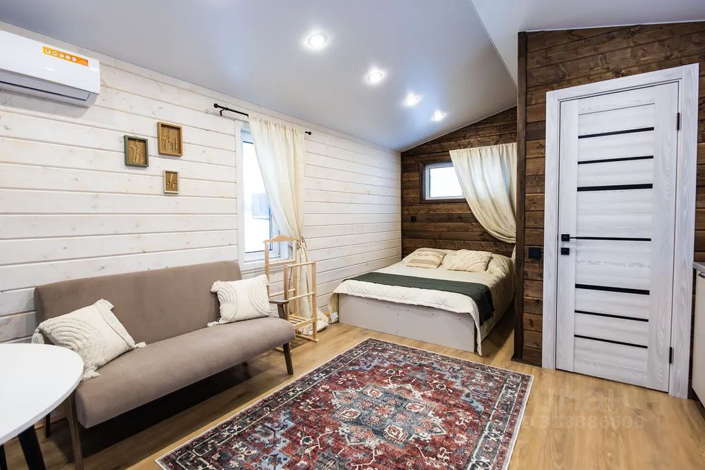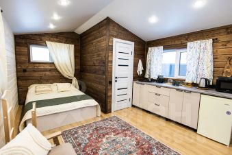 - Гостиная и оборудованная кухня: холодильник, микроволновка, чайник, набор посуды, плита по запросу