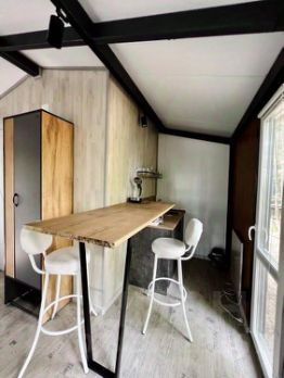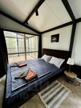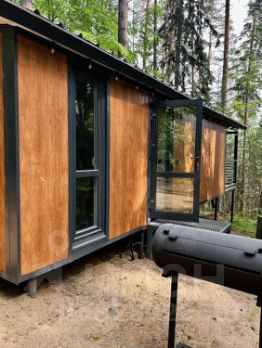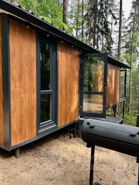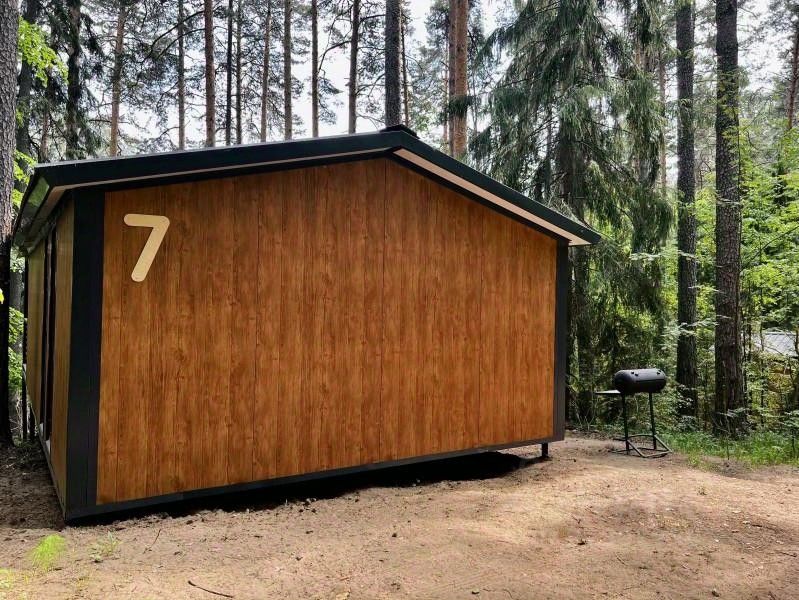 В домике есть крытая веранда, где открывается прекрасный вид на сосновый лес и Каму. Домик оборудован современной мини-кухней с холодильником, чайником и барной стойкой. За перегородкой расположена спальная зона с большой кроватью. Помимо большой кровати есть раскладной диван. В домике присутствует умный телевизор, WI-FI и сауна. Бонусом к каждому домику идет своя мангальная зона.