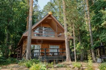 Вилла на 8 человек: уличная терраса с видом на Каму с большим столом и скамейками, большой стол со скамейками в доме, камин, телевизор, мангальная зона. Мини-кухня, в которой есть кухонный уголок, холодильник, микроволновая печь, плита, чайник, посуда на 10 персон. Большая игровая зона на улице перед домом.