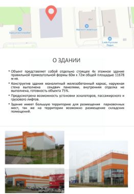 Конструктив здания монолитный железобетонный каркас, наружная стена выполнена сендвич панелями, внутренняя отделка не выполнена, готовность объекта 75%.