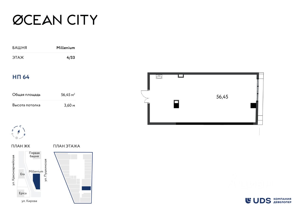 Выбирайте ликвидное коммерческое помещение, чтобы сдавать по топовой ставке! Престижная коммерция в лучшем небоскребе - в самой высокой строящейся башне OCEAN CITY. Количество помещений ограничено. Успейте приобрести на этапе строительства. Новая башня, высотой 33 этажа, располагается на перекрестке улиц Пушкинская и Кирова вдоль нового пешеходного бульвара OCEAN CITY. Современная инфраструктура комплекса в сочетании с выгодным центральным месторасположением OCEAN CITY обеспечат коммерческие помещения активным трафиком. Четыре нижних этажа башни - коммерческие, жилая часть дома начинается с уровня 5 этажа. Входы в торговую часть и жилую - разделены. Отдельные лифты для коммерческого блока. Все окна в OCEAN CITY - панорамные с остеклением в пол. Подземный паркинг на -1 этаже. Срок передачи ключей - до 31 марта 2028. Запишитесь на экскурсию.