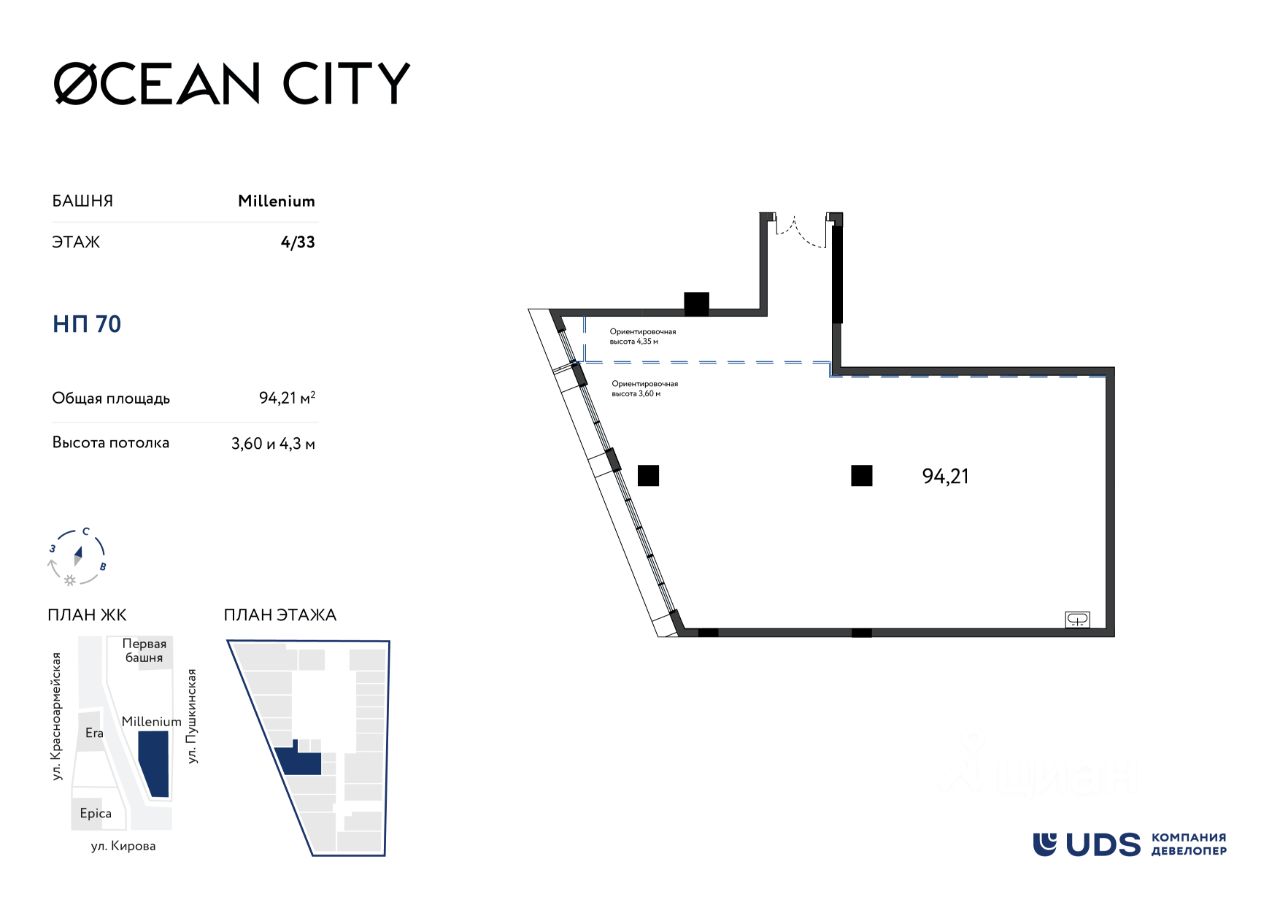 Выбирайте ликвидное коммерческое помещение, чтобы сдавать по топовой ставке! Престижная коммерция в лучшем небоскребе - в самой высокой строящейся башне OCEAN CITY. Количество помещений ограничено. Успейте приобрести на этапе строительства. Новая башня, высотой 33 этажа, располагается на перекрестке улиц Пушкинская и Кирова вдоль нового пешеходного бульвара OCEAN CITY. Современная инфраструктура комплекса в сочетании с выгодным центральным месторасположением OCEAN CITY обеспечат коммерческие помещения активным трафиком. Четыре нижних этажа башни - коммерческие, жилая часть дома начинается с уровня 5 этажа. Входы в торговую часть и жилую - разделены. Отдельные лифты для коммерческого блока. Все окна в OCEAN CITY - панорамные с остеклением в пол. Подземный паркинг на -1 этаже. Срок передачи ключей - до 31 марта 2028. Запишитесь на экскурсию.