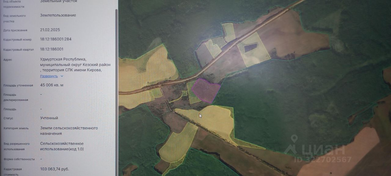 Аукцион в электронной форме с открытой формой подачи предложений по продаже земельного участка с кадастровым номером 18:12:186001:284 площадью 45006 кв.м., по адресу: Удмуртская Республика, муниципальный округ Кезский район, территория СПК имени Кирова, земельный участок 2. Разрешенное использование земельного участка Сельскохозяйственное использование (код 1.0)