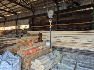 Сортировочная площадка, зона выгрузки лесоматериала и зона погрузки готовой продукции оснащены козловым краном, обеспечивающим быструю и эффективную погрузку и выгрузку продукции. Дебет площадки позволяет хранить до 2000 м пиломатериалов и лесоматериалов одновременно.