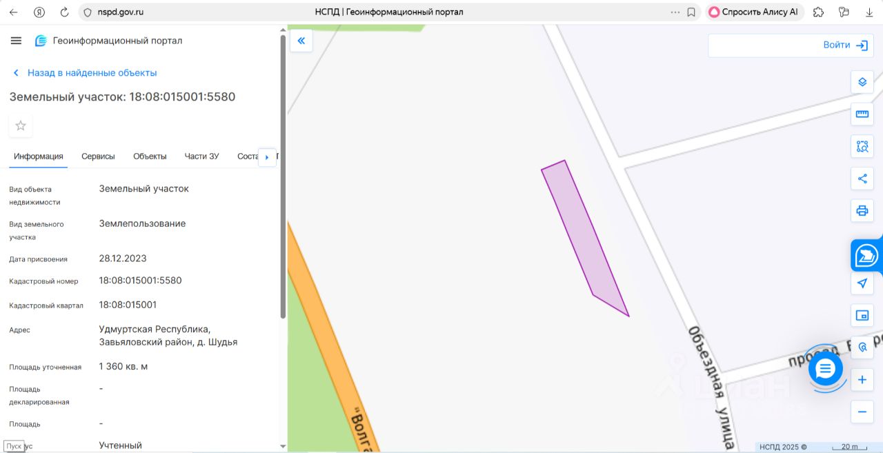 Земельный участок площадью 1 360 кв. м, категория земель земли населенных пунктов, виды разрешенного использования индивидуальное жилищное строительство, кадастровый номер 18:08:015001:5580, местонахождение: Удмуртская Республика, Завьяловский р-н, д. Шудья. Обременение: аресты. В соответствии с рапортом СПИ от 05.11.2025, строения на земельном участке отсутствуют. Вид права собственность. Обременение аресты. Собственник Мамаев Н.Л. (уведомление 0001316 от 13.11.2025).