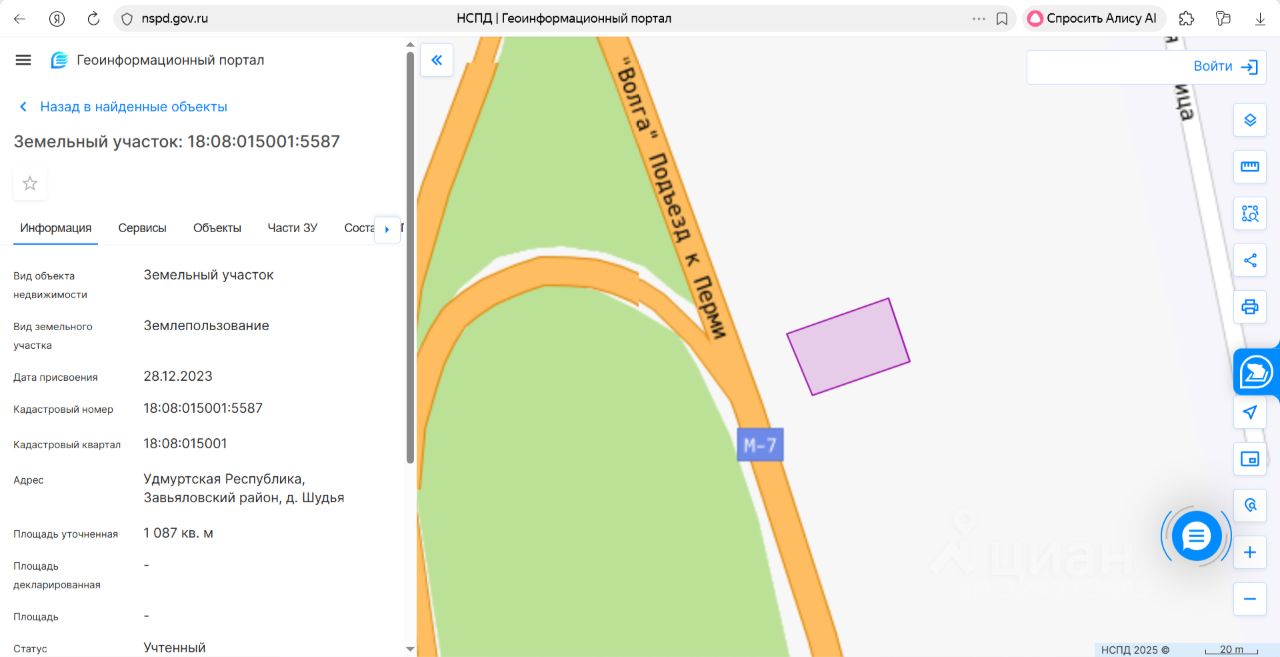 Земельный участок площадью 1087 кв. м, категория земель земли населенных пунктов, виды разрешенного использования индивидуальное жилищное строительство, кадастровый номер 18:08:015001:5587, местонахождение: Удмуртская Республика, Завьяловский р-н, д. Шудья. Обременение: аресты. В соответствии с рапортом СПИ от 05.11.2025, строения на земельном участке отсутствуют. Вид права собственность. Обременение аресты. Собственник Мамаев Н.Л. (уведомление 0001314 от 13.11.2025).