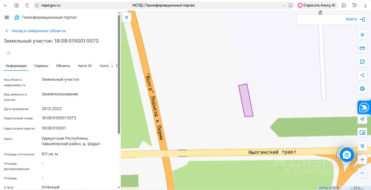 Земельный участок площадью 811 кв. м, категория земель земли населенных пунктов, виды разрешенного использования индивидуальное жилищное строительство, кадастровый номер 18:08:015001:5573, местонахождение: Удмуртская Республика, Завьяловский р-н, д. Шудья. Обременение: аресты. В соответствии с рапортом СПИ от 05.11.2025, строения на земельном участке отсутствуют. Вид права собственность. Обременение аресты. Собственник Мамаев Н.Л. (уведомление 0001315 от 13.11.2025).