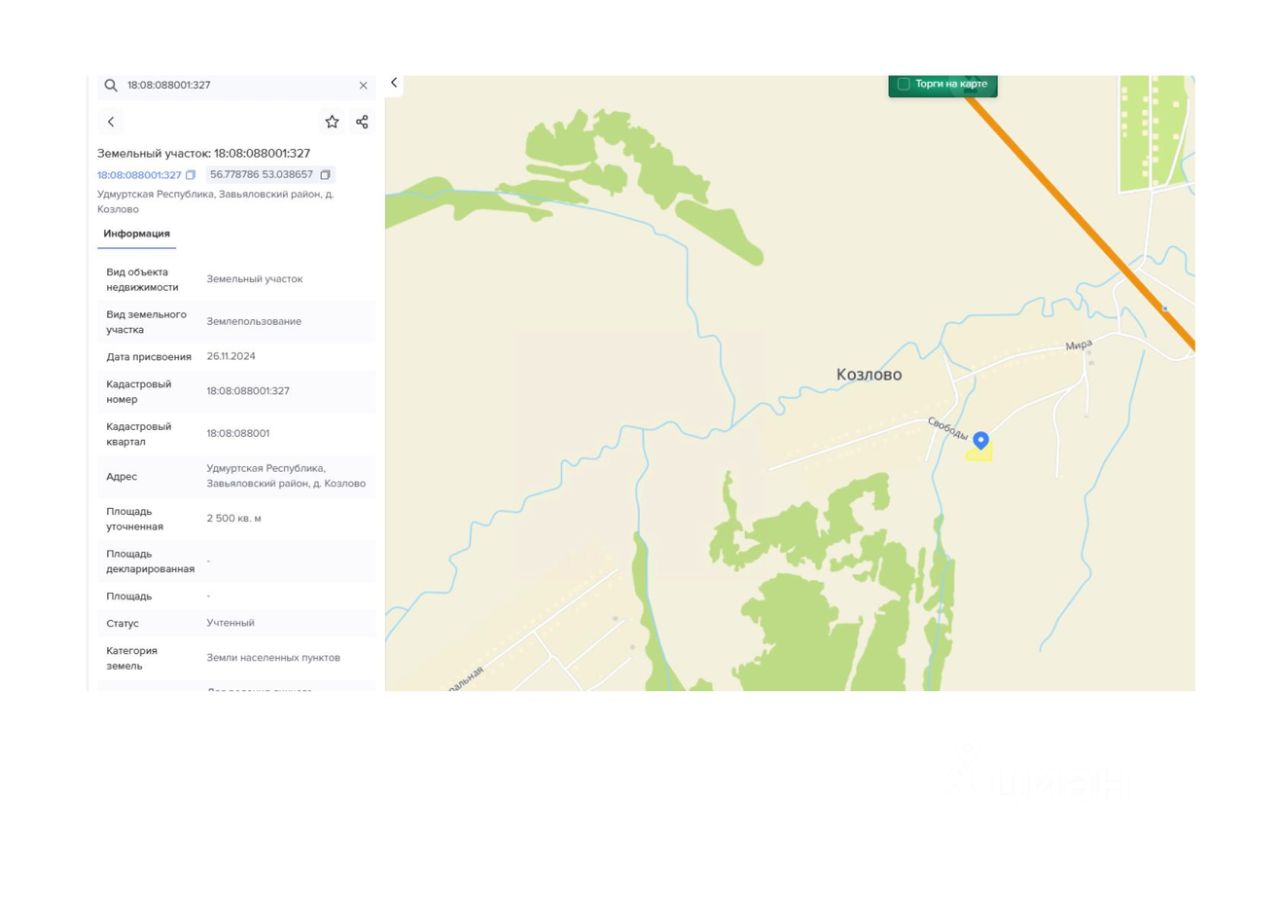 Земельный участок с кадастровым номером 18:08:088001:327 площадь 2500 по адресу Удмуртская Республика, Завьяловский район, д. Козлово