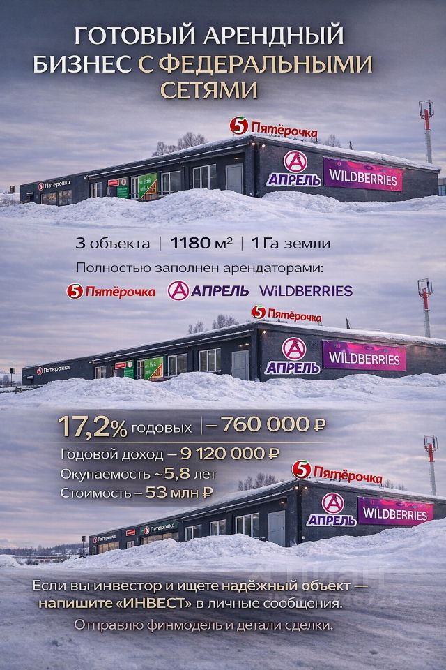 Продам готовый арендный бизнес . 17,2 % годовых, окупаемость 5,8 лет. 3 здания общей площадью 1180 кв.м . на 1 Га земли . Арендаторы Пятёрочка, аптека Апрель, Вайлдбериз , салон красоты , строительный магазин . МАП 760 т.р. Подробнее в личном диалоге.