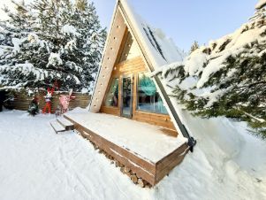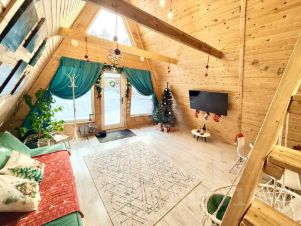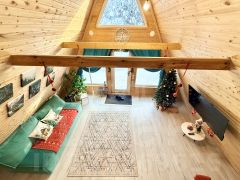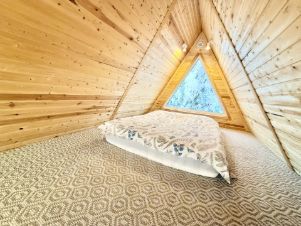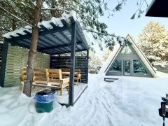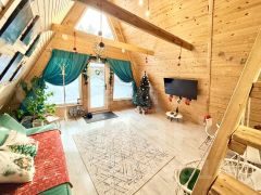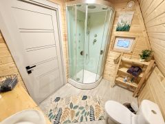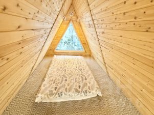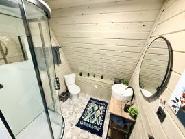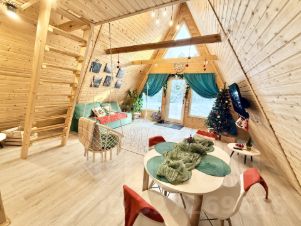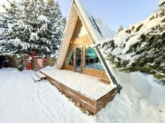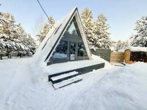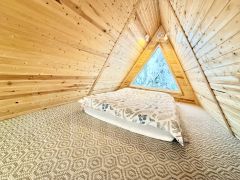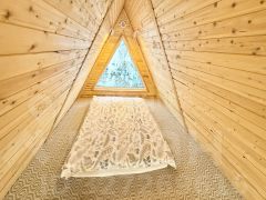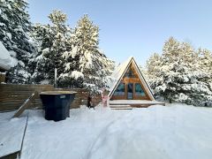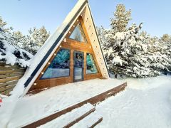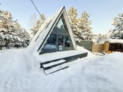 Для размещения гостей предусмотрены два отдельных дома формата A-frame и малый дом с идентичной комплектацией: каждый имеет собственную кухню, санузел, мебель и необходимую бытовую технику, включая TV и холодильник.