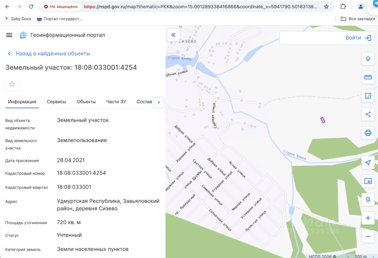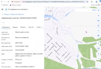 Земельный участок площадью 720 кв. м, категория земель земли населенных пунктов, виды разрешенного использования индивидуальные жилые дома 1-3 этажа с приусадебными земельными участками с возможностью содержания домашнего скота и птицы, согласно установленным ограничениям (Ж Зона застройки индивидуальными жилыми домами), кадастровый номер 18:08:033001:4254, местонахождение: Удмуртская Республика, Завьяловский район, д. Сизево. По информации от СПИ, строения на земельном участке отсутствуют. Вид права собственность. Обременение ограничения, предусмотренные ст. 56 ЗК РФ, аресты, в том числе Нижегородского РОСП г. Нижнего Новгорода. Согласно сведениям из Единого государственного реестра недвижимости в отношении объекта представлены документы на государственную регистрацию. Собственник Ионенкова В.Л. (уведомление 291 от 19.02.2026).