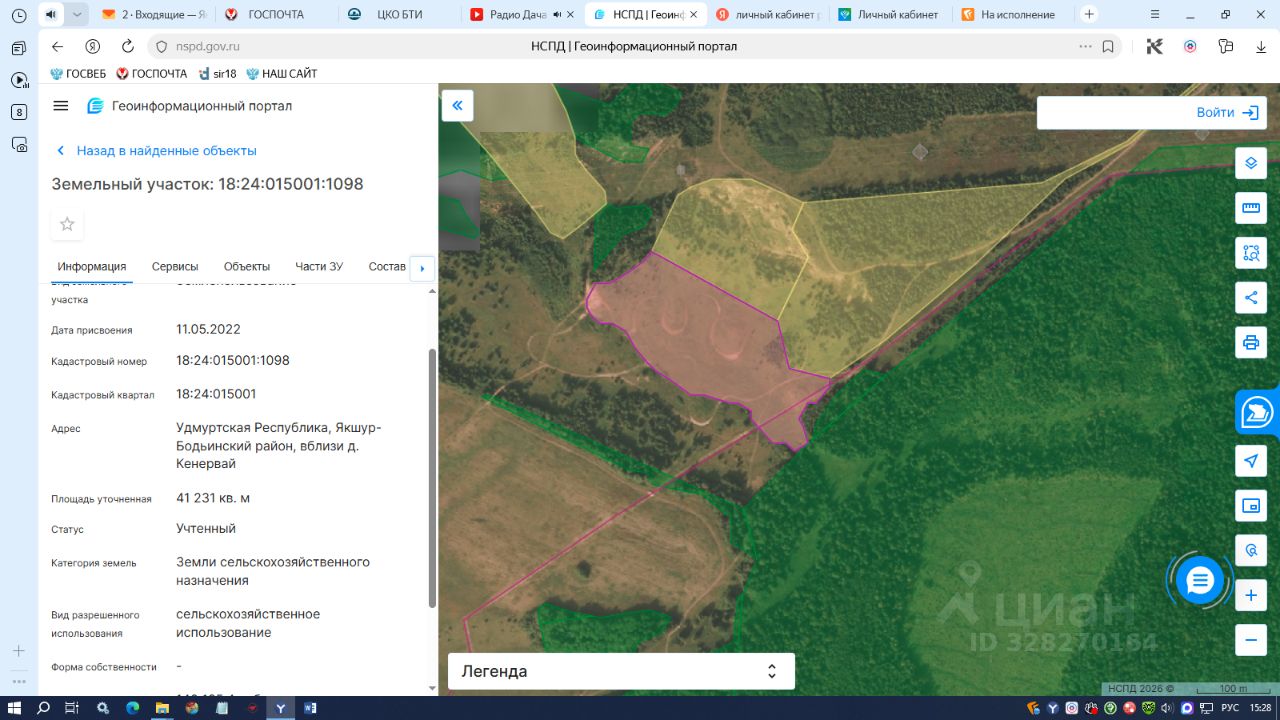 земельный участок с кадастровым номером 18:24:015001:1098, общей площадью 41231 кв.м., из земель сельскохозяйственного назначения, расположенного по адресу: Удмуртская Республика, Якшур-Бодьинский район, вблизи д. Кенервай, с разрешенным использованием: сельскохозяйственное использование