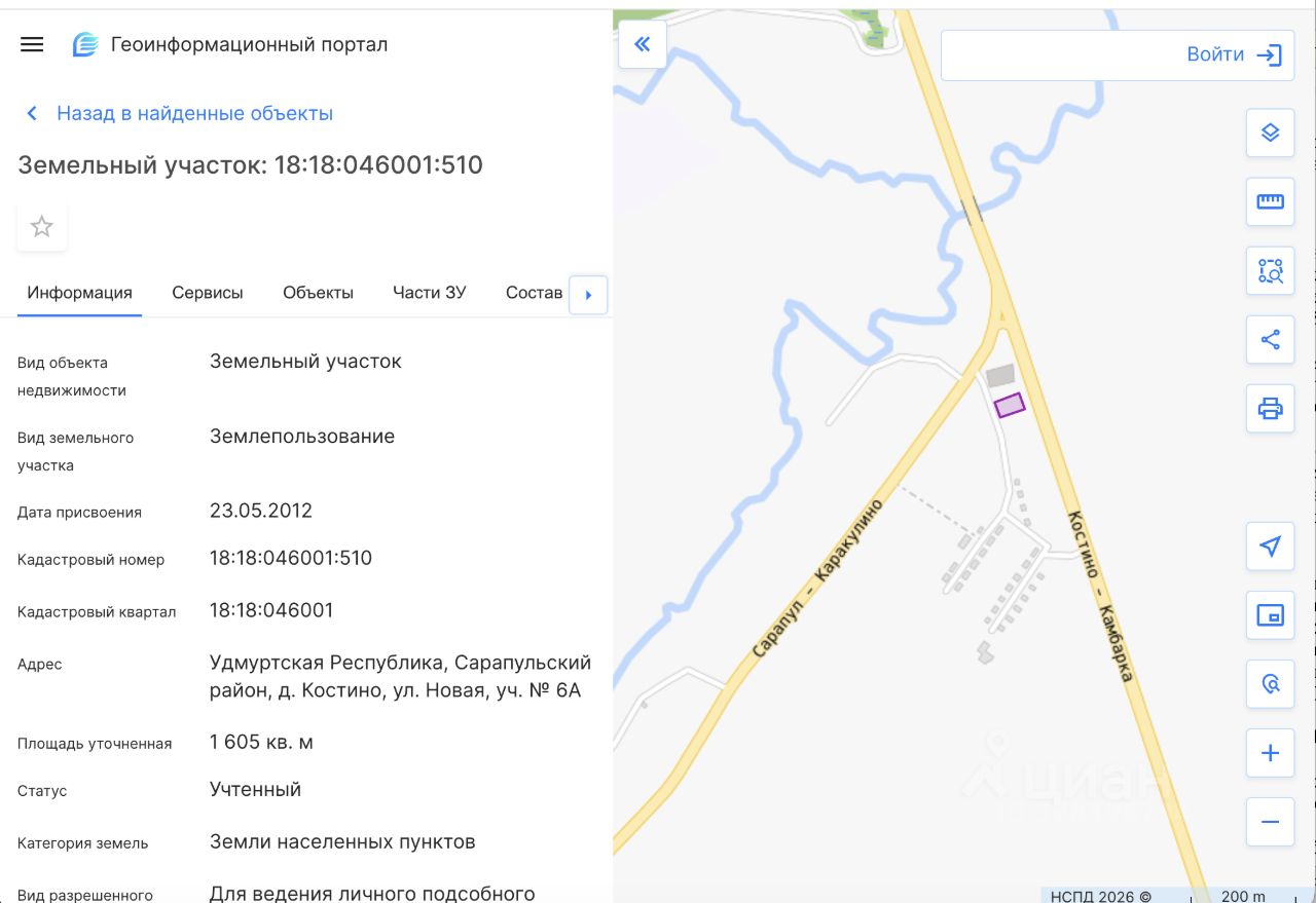 Подвергнутое аресту ОСП по г. Сарапулу УФССП России по Удмуртской Республике по исполнительному производству 305607/25/18039-ИП от 17.12.2025 г., имущество: Земельный участок площадью 1 605 кв. м, категория земель земли населенных пунктов, виды разрешенного использования для ведения личного подсобного хозяйства, кадастровый номер 18:18:046001:510, местонахождение: Удмуртская Республика, Сарапульский район, д. Костино, ул. Новая, уч. 6а, принадлежащий должнику Мирзаеву Сарвару Шавкатовичу, и находящийся в залоге у КПКГ "Партнер". По сведениям от СПИ, строения на земельном участке отсутствуют. Обременение: аресты, ипотека, ограничения, предусмотренные ст. 56 ЗК РФ. Вид права: собственность. (Уведомление 220 от 09.02.2026 г.).