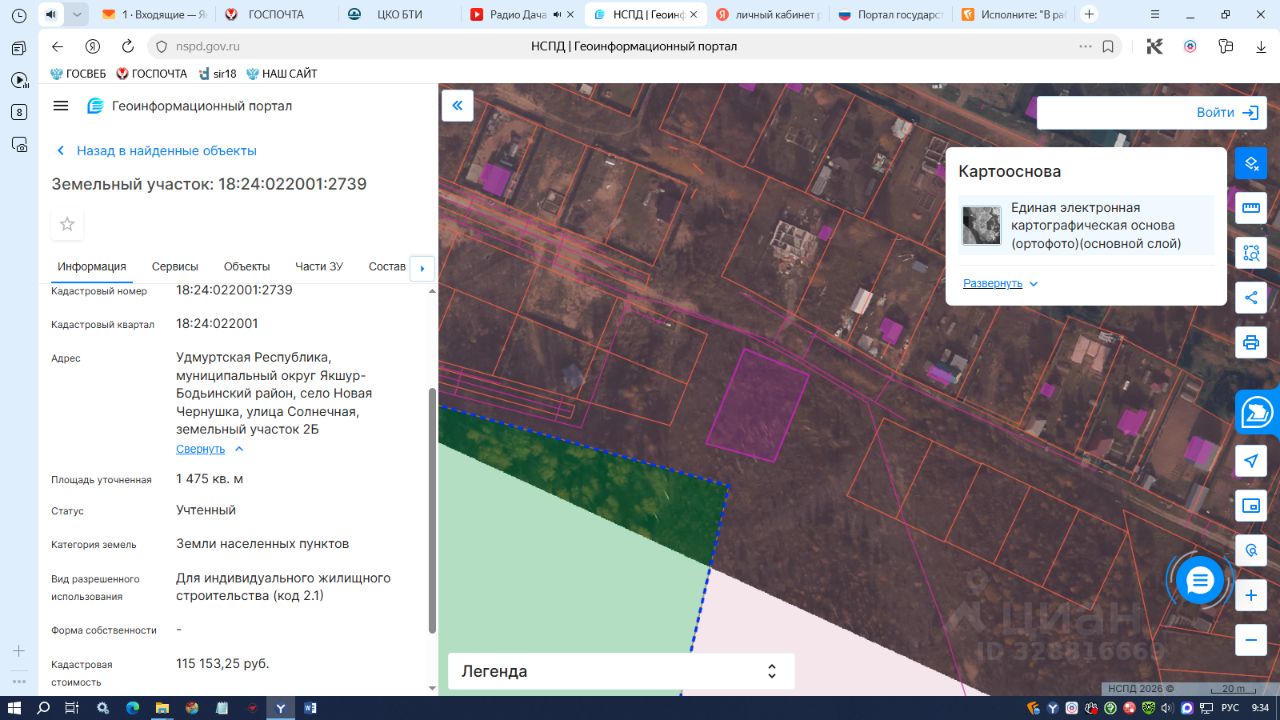 земельный участок с кадастровым номером 18:24:022001:2739, общей площадью 1475 кв.м., из земель населенных пунктов, расположенного по адресу: Удмуртская Республика, муниципальный округ Якшур-Бодьинский район, село Новая Чернушка, улица Солнечная, земельный участок 2Б, с разрешенным использованием: Для индивидуального жилищного строительства (код 2.1)