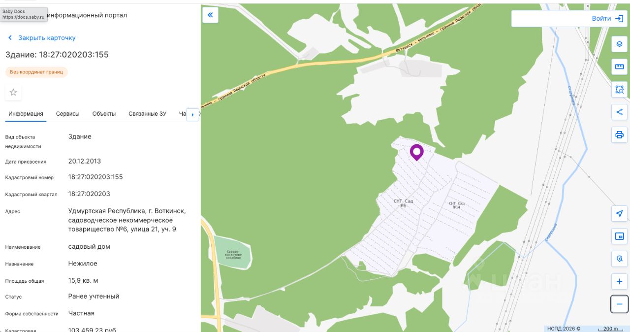 Земельный участок, категория земель земли населенных пунктов, виды разрешенного использования садоводство, площадь 400 кв. м, кадастровый номер 18:27:020203:53; садовый дом площадью 15,9 кв. м, назначение нежилое, кол-во этажей 2 (в том числе подземных 0), кадастровый номер 18:27:020203:155, местонахождение: Удмуртская Республика, г. Воткинск, СНТ 6, ул. 21, уч. 9. Вид права собственность. Обременение аресты. Собственник ИП Мещеряков С.И. (уведомление 000030-ГМУ от 03.02.2026).