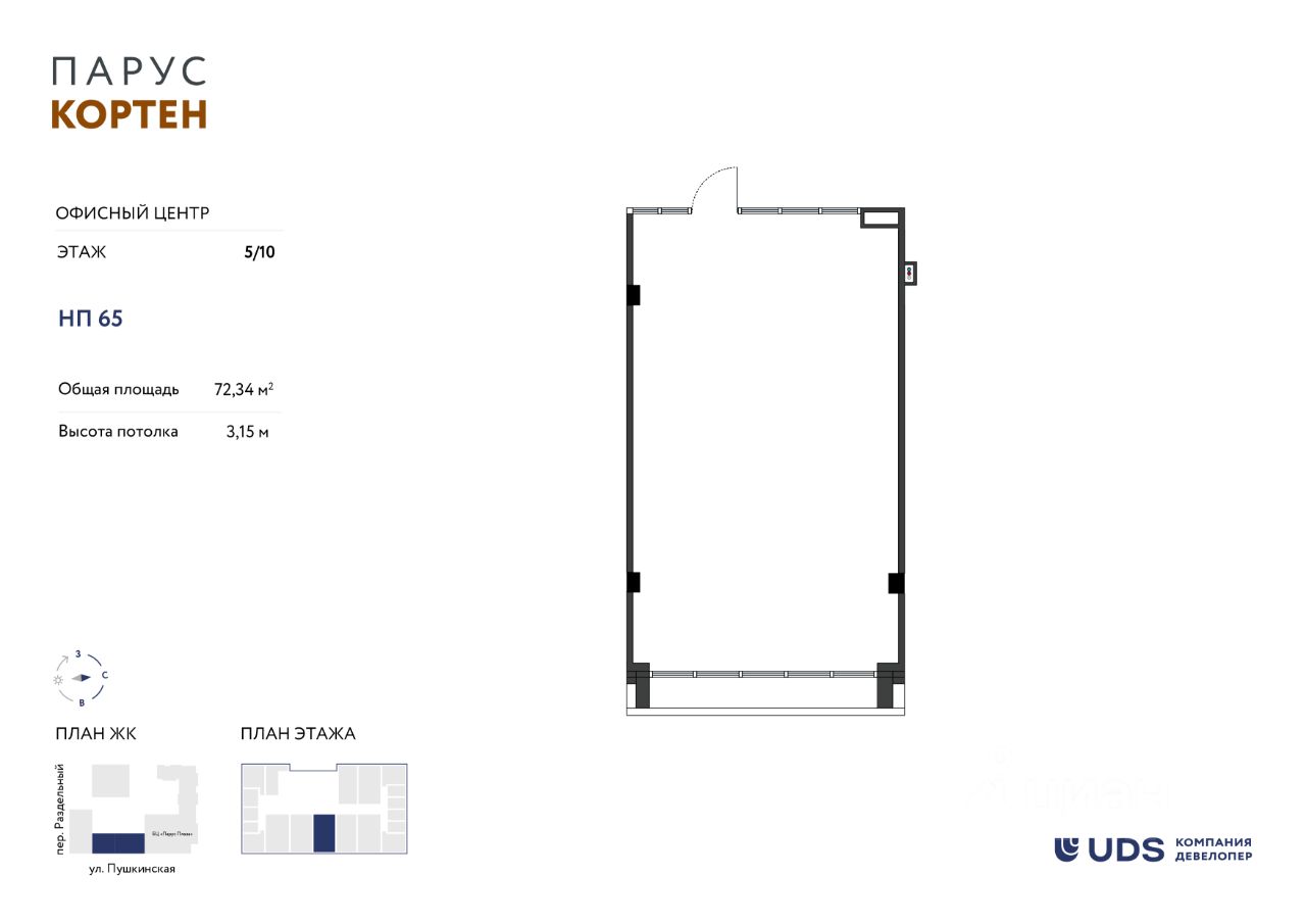 Помещение свободного назначения 72,34 м² (5 этаж, окна на ул. Пушкинскую).