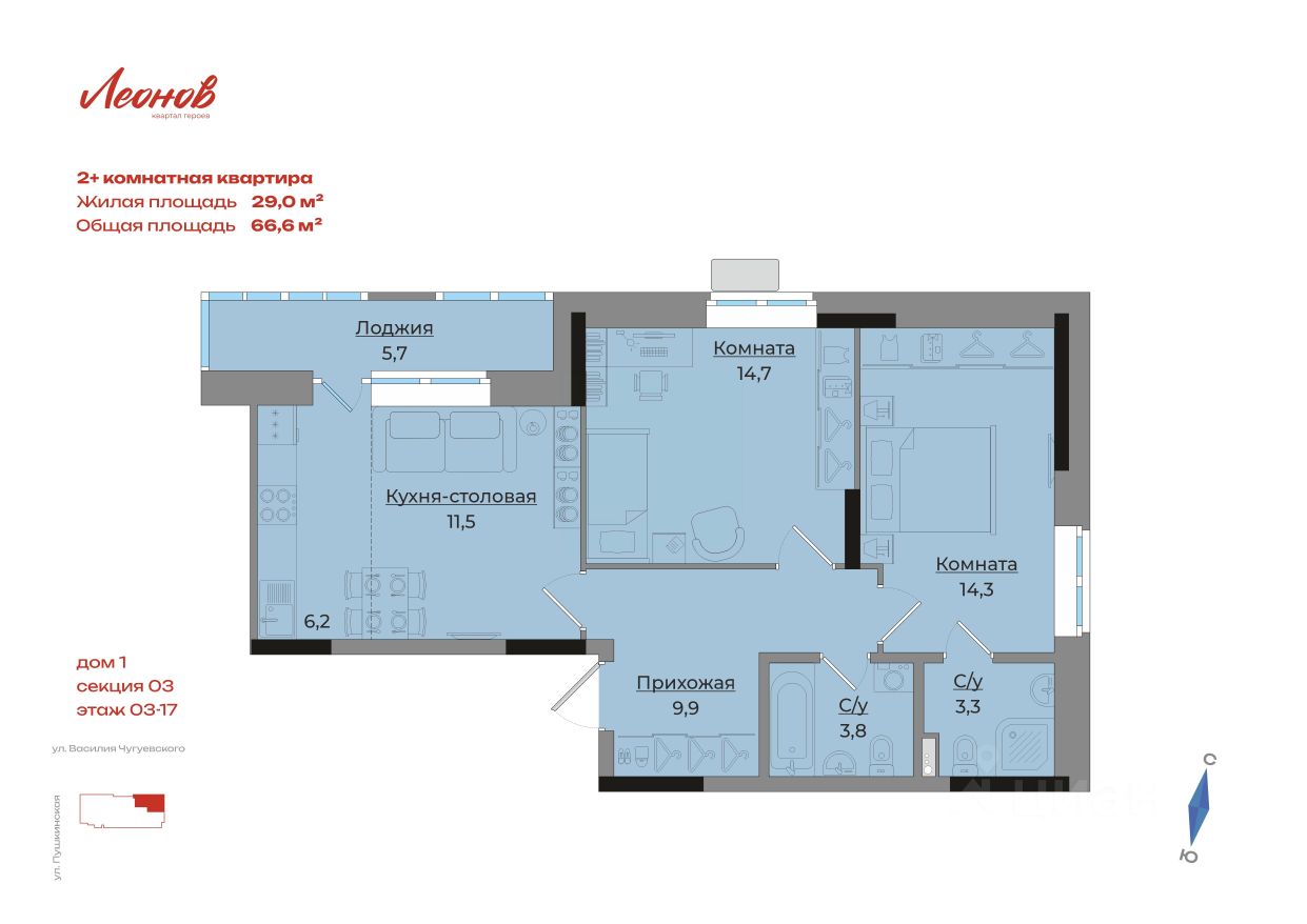Квартал героев Леонов, Дом 1- это семейный квартал, расположенный в центральном районе г. Ижевска, на пересечении улиц Пушкинской и В. Чугуевского. Удобная транспортная развязка позволит за 7 минут добраться до Центральной площади, сходить в Цирк или прогуляться в "Летнем саду". В шаговой доступности вся инфраструктура центра города, продуктовые магазины, аптеки, мед. учреждения, автосервисы, кафе, рестораны, эко-рынки, образовательные и развлекательные учреждения: ВкусВилл, Школа 91, Спорт.клуб "Проформа", Школа 97, Школа искусств 9, Дом Дружбы народов, ЗАГС, Гастроном, Лингвистический Лицей 25, Цирк, Шахматный клуб, Школа юных летчиков, Бассейн "Сила воды", Стадион "Динамо", Михайловский собор, Летний сад, Стелла "Навеки с Россией", Гуманитарный лицей 30, Центральная площадь. Квартал героев Леонов единственный в своем роде проект квартальной застройки в микрорайоне "Ю-2". Мы включили в него закрытый внутренний двор без машин, огороженный с трех сторон домами, парковочные места вынесены за периметр двора, отсутствие шума от дороги за счет того, что дома не примыкают непосредственно к проезжей части. 17-этажное трехсекционное здание дома позволяет своим жителям уже со средних этажей любоваться панорамными видами из своих окон. Преимущества дома: Парадный холл в стильной благородной отделке и понятной навигацией. Колясочные для хранения колясок и спортивного инвентаря вне квартиры. Велопарковки организованы у каждого подъезда. Места для консьержа в каждой секции для организации чистоты и порядка. Сквозные подъезды для удобства захода в здание и изнутри двора и со стороны улицы. Просторные и бесшумные лифты по два в каждом подъезде для быстрой и бесперебойной работы. Обустройство придомовой территории: Для маленьких детей: качели, песочница, батуты. Для детей постарше: велосипедная дорожка, спортивная площадка, зимой хоккейная площадка. Для взрослых: пергола зона с шезлонгами и скамьями для отдыха. Для всех возрастов: пешеходные дорожки, газоны, клумбы, ель в центре двора. Технологические решения: Теплое панорамное остекление лоджий с двухкамерными стеклопакетами. Увеличенные окна с пятикамерным профилем. Надежная металлическая входная дверь с проверенной фурнитурой. Корзины для кондиционеров для единого стиля фасада. Толстые наружные стены (кирпичные стены с фасадным утеплением). Полусухая стяжка пола. Трубы с пониженным уровнем шума Безопасность: Система видеонаблюдения по периметру квартала и во дворе. Видеодомофоны. Огороженная территория квартала. Зона консьержа. Противопожарная система (пожарные датчики, дымоудаление). Предусмотрена предчистовая или чистовая отделка квартиры современными материалами в светлых тонах. Срок ввода в эксплуатацию IV кв. 2025г. Условия приобретения: ФЗ-214 (с эскроу-счетом) Скидка при 100% оплате Все виды ипотеки Квартал Леонов представляет собой воплощение лучших современных стандартов жилья комфорт-класса, гармонично вписывается в сложившуюся городскую архитектуру и развивает террит