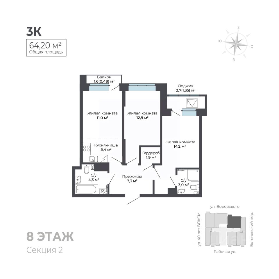 На первом этаже расположена торговая галерея. Дом оснащен автономной системой отопления и видеонаблюдением для вашей безопасности. Для удобства жителей предусмотрены наземный паркинг и большая городская парковка, а также индивидуальные кладовые помещения.