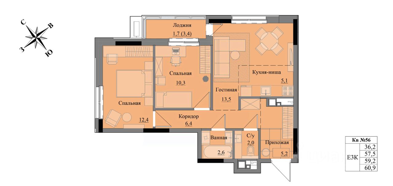 Общая площадь59,2 м²