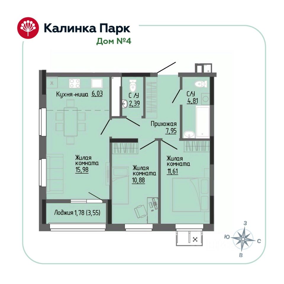 Продается двухкомнатная квартира в новом доме 4 микрорайона "Калинка Парк".
