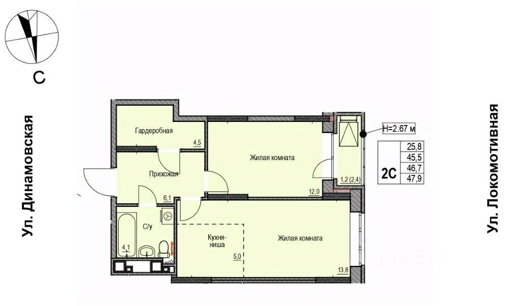 Продаётся 2-комнатная квартира в строящемся доме (Дом 1), срок сдачи: II-кв. 2027, общей площадью 46.7 кв.м., на 4 этаже. ЖК "Локомотив" - это жилой комплекс, состоящий из трех домов, объединенных стилобатом. Удобное расположение, 15 минут до центра.