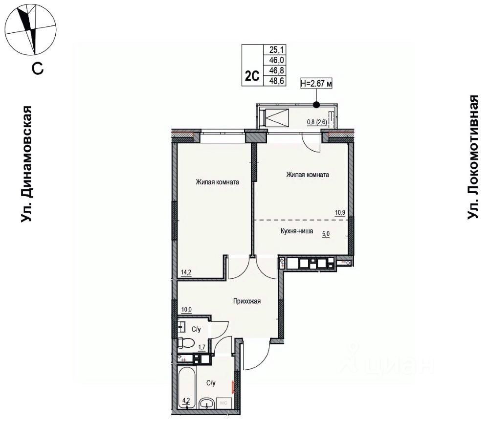 Продаётся 2-комнатная квартира в строящемся доме (Дом 1), срок сдачи: II-кв. 2027, общей площадью 46.8 кв.м., на 14 этаже. ЖК "Локомотив" - это жилой комплекс, состоящий из трех домов, объединенных стилобатом. Удобное расположение, 15 минут до центра.