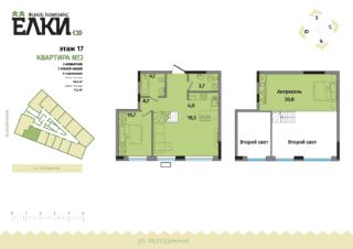Уникальное предложение - двухуровневая двухкомнатная квартира с кухней-нишей на 17 этаже ЖК "Елки"-3. Квартира с увеличенной высотой потолка - 4,9 м, и вторым этажом над частью квартиры. На первом уровне размещены просторная кухня-гостиная площадью почти 23 м2 с 2 окнами и вторым светом, и детская с высокими потолками. Высота окон в комнатах 3,8 м, выходят на восток, красивый вид на город. На антресольном этаже спальня площадью почти 21 м2. В квартире 2 санузла, в прихожей есть место под шкаф для уличной одежды и обуви. Застройщику можно заказать один из 5 вариантов чистовой отделки и сразу переехать в готовую для жизни квартиру.