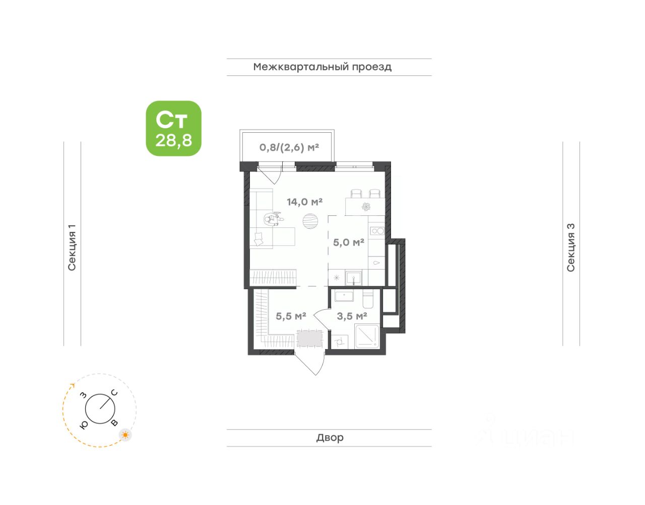 Площадь 28,8 кв.м. с возможностью зонирования на зону отдыха и кухню.