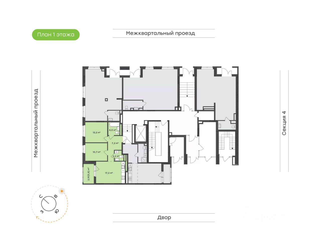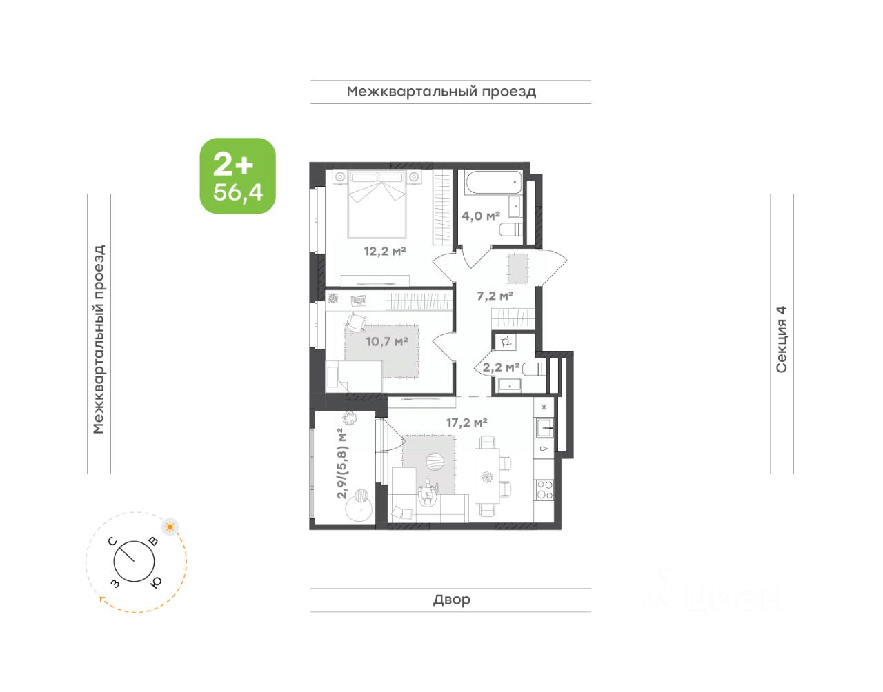 Общая площадь 56,4 кв.м., включая собственную гардеробную комнату.
