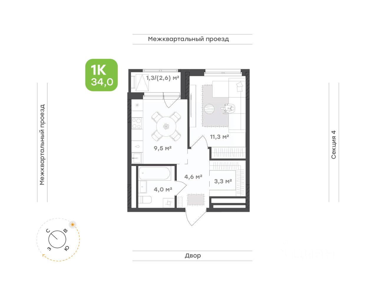 Площадь 34 кв.м. с удобной планировкой: отдельная спальня, кухня и дополнительное место для хранения.