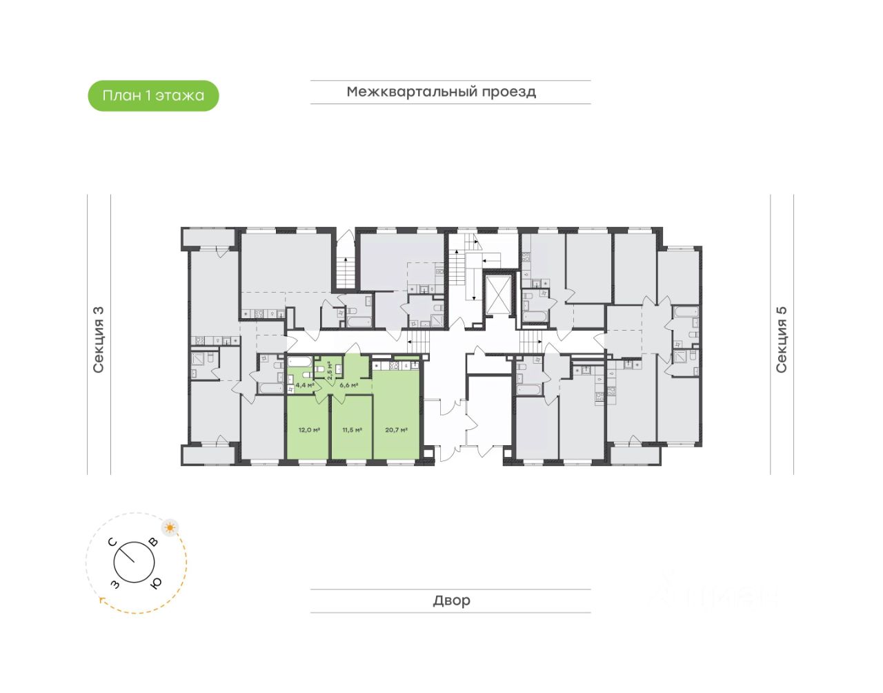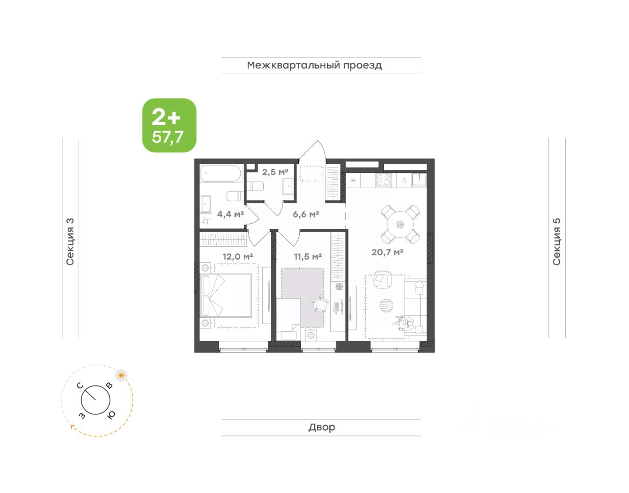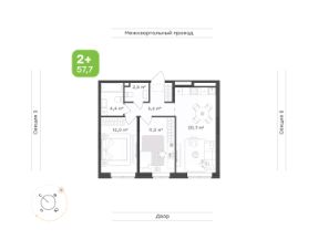 Общая площадь 57,7 кв.м., включая собственную гардеробную комнату.