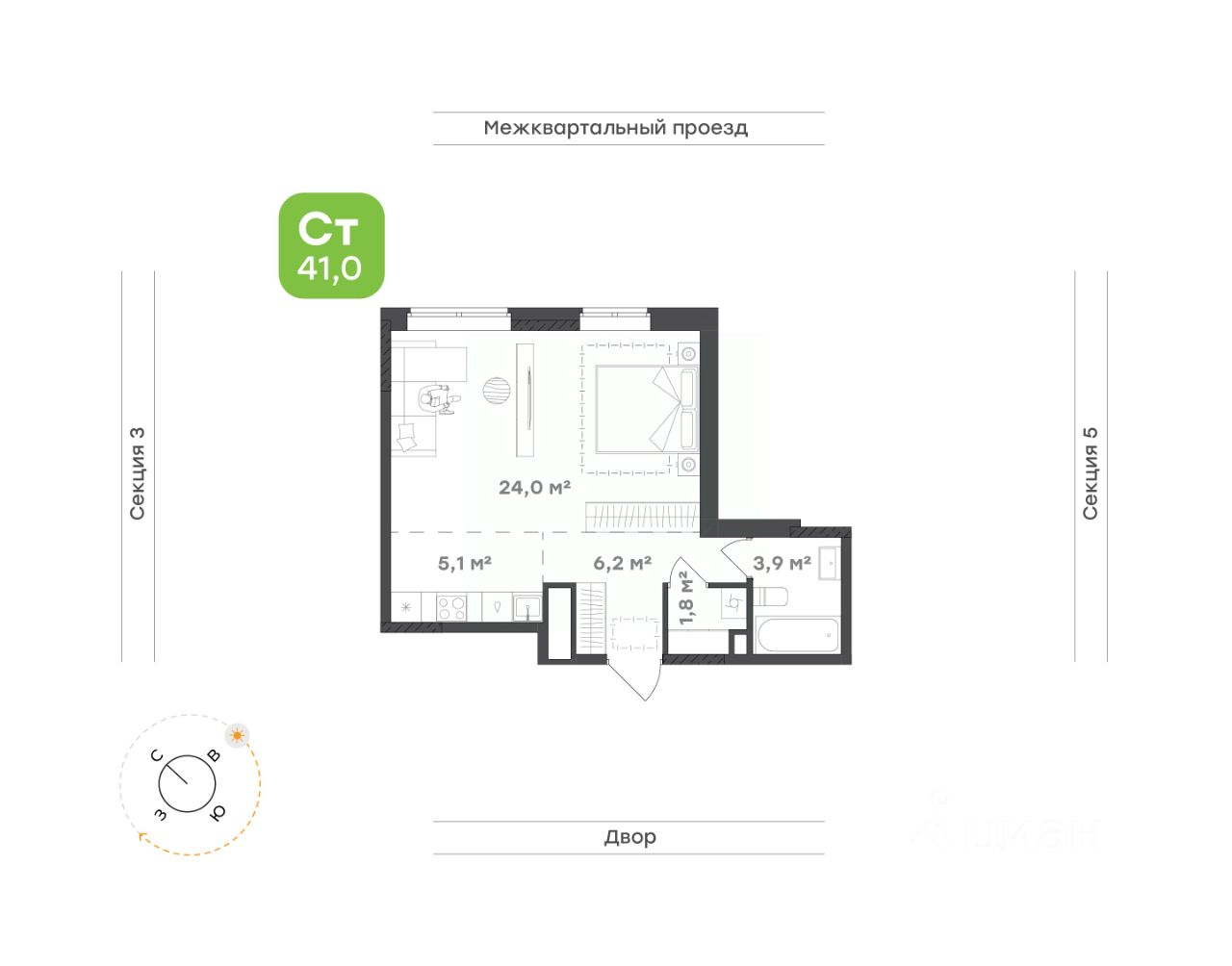 Площадь 41 кв.м. с возможностью зонирования на зону отдыха и кухню.