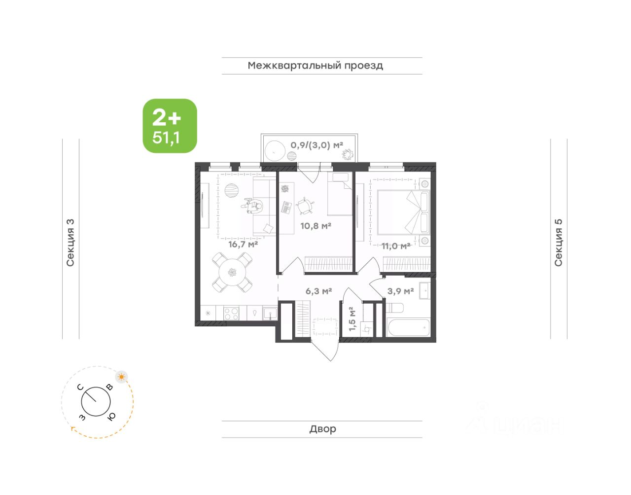 Общая площадь 51,1 кв.м., включая собственную гардеробную комнату.