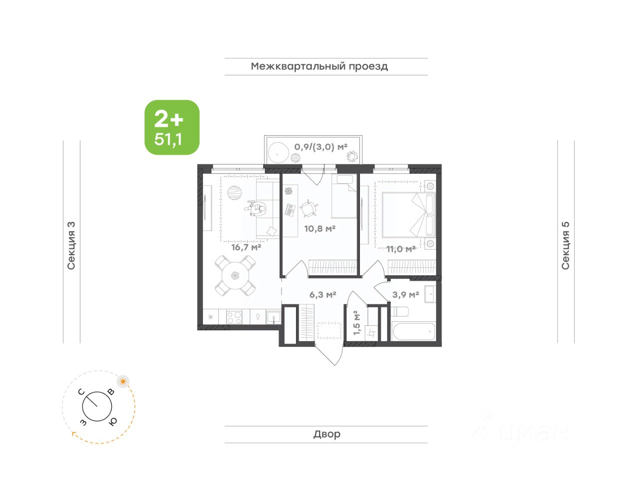 Общая площадь 51,1 кв.м., включая собственную гардеробную комнату.