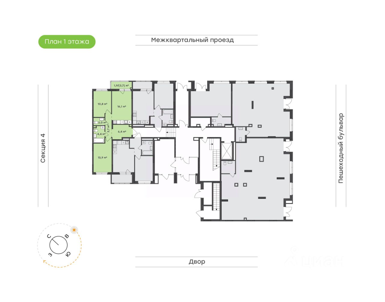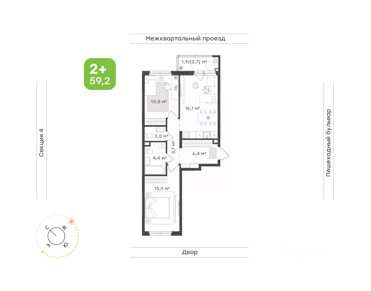 Общая площадь 59,2 кв.м., включая собственную гардеробную комнату.