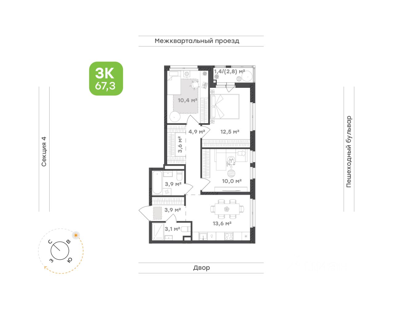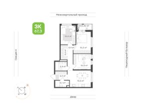 Общая площадь 67,3 кв.м. с тремя изолированными спальнями и классической кухней.