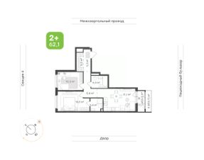 Площадь 62,1 кв.м. с двумя спальнями, двумя санузлами, кухней-гостиной и продуманным зонированием.
