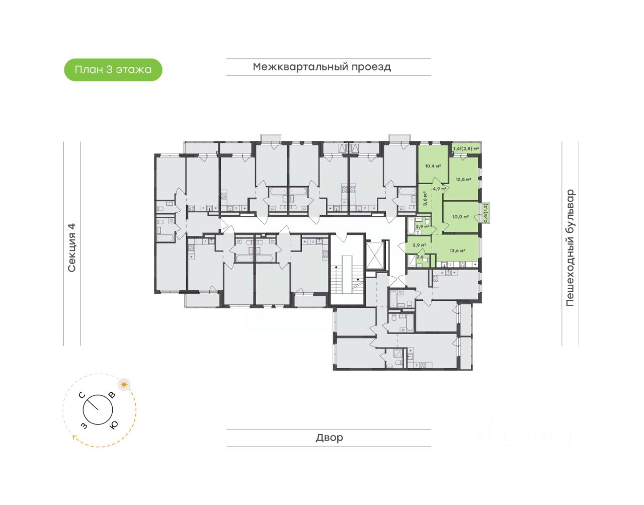 Общая площадь 67,2 кв.м. с тремя изолированными спальнями и классической кухней.