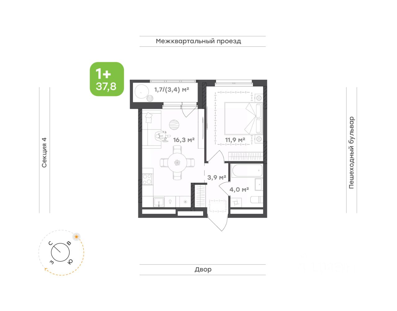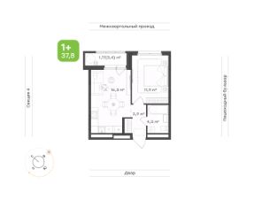 Площадь 37,8 кв.м. с объединенной зоной кухни, столовой и гостиной, а также отдельная спальня.