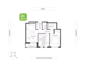 Площадь 55,3 кв.м. с двумя спальнями, двумя санузлами, кухней-гостиной и продуманным зонированием.