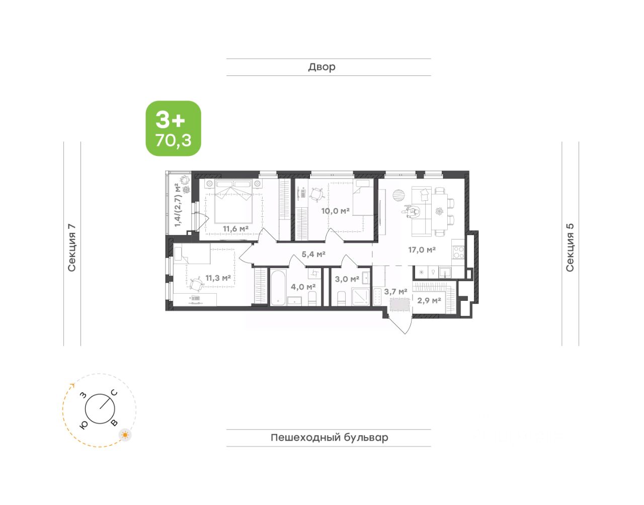 Общая площадь 70,3 кв.м. с тремя изолированными спальнями и объединенной зоной кухни, столовой и гостиной.