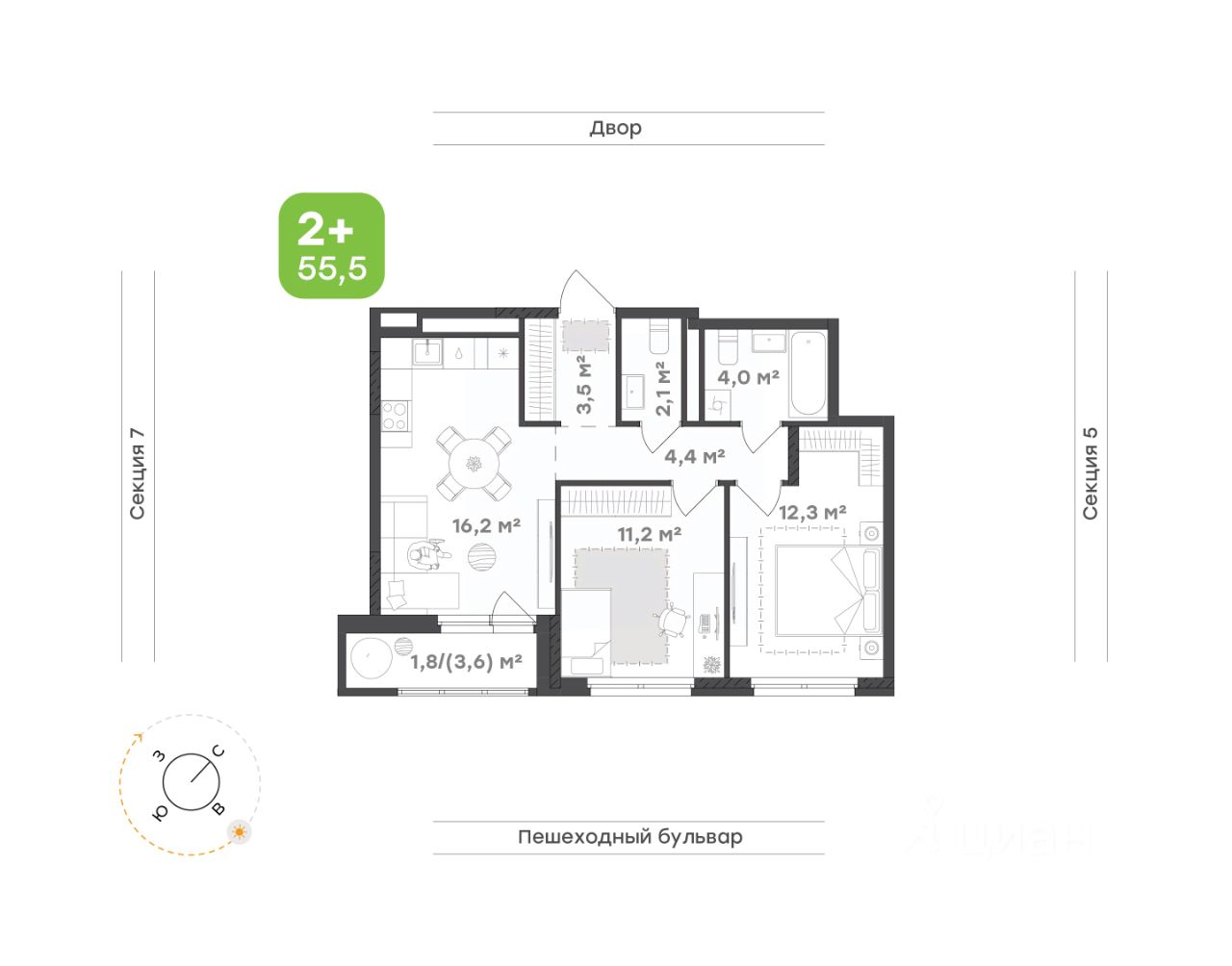 Площадь 55,5 кв.м. с двумя спальнями, двумя санузлами, кухней-гостиной и продуманным зонированием.
