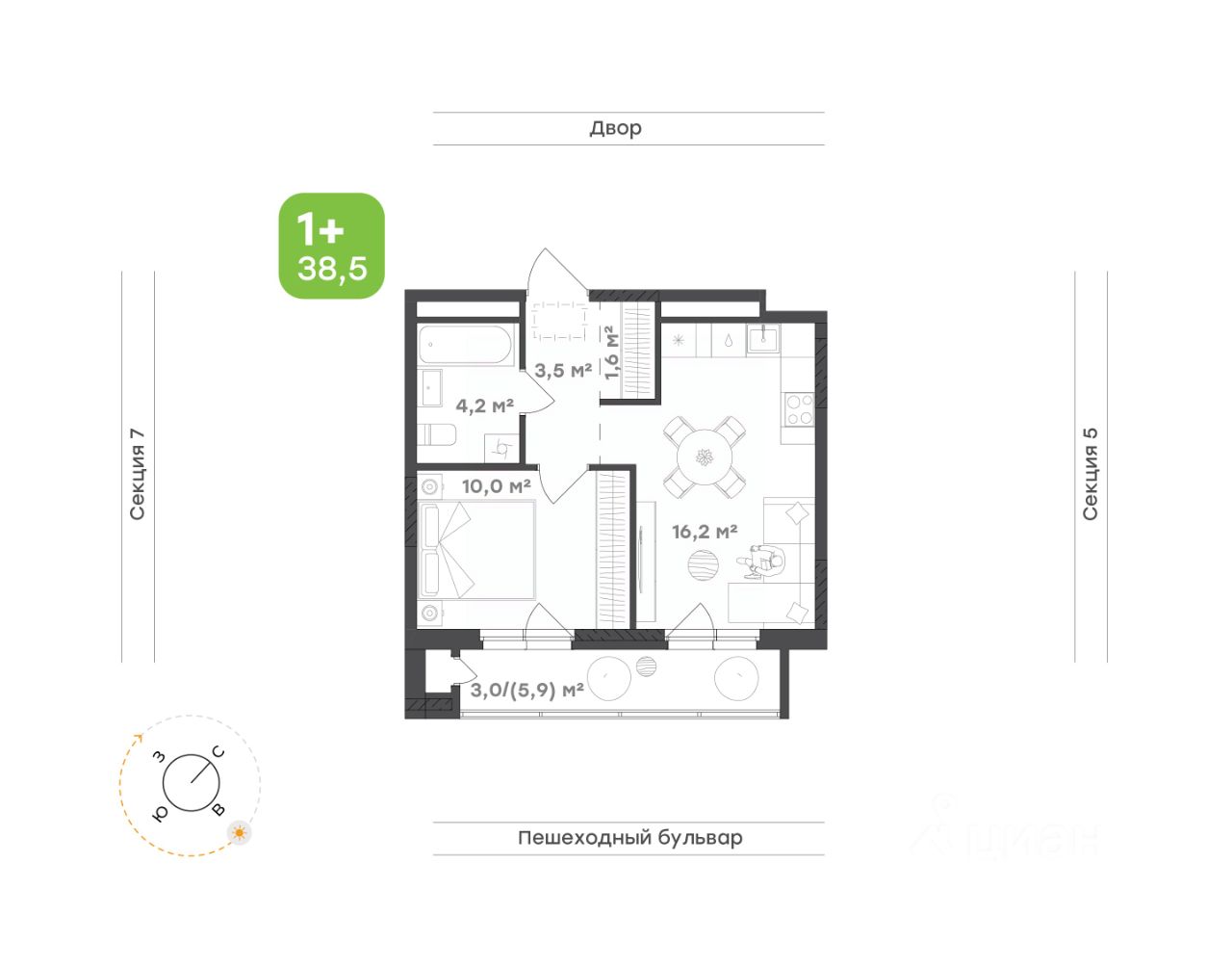 Площадь 38,5 кв.м. с совмещенной кухней-гостиной, обособленной спальней, личной гардеробной и возможностью оборудовать рабочее место.