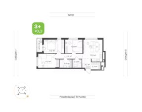 Общая площадь 70,3 кв.м. с тремя изолированными спальнями и объединенной зоной кухни, столовой и гостиной.