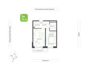 Площадь 42,8 кв.м. с совмещенной кухней-гостиной, обособленной спальней, личной гардеробной и возможностью оборудовать рабочее место.