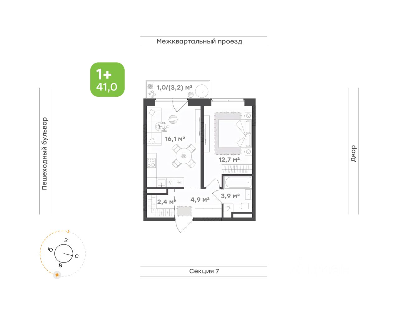 Площадь 41 кв.м. с совмещенной кухней-гостиной, обособленной спальней, личной гардеробной и возможностью оборудовать рабочее место.